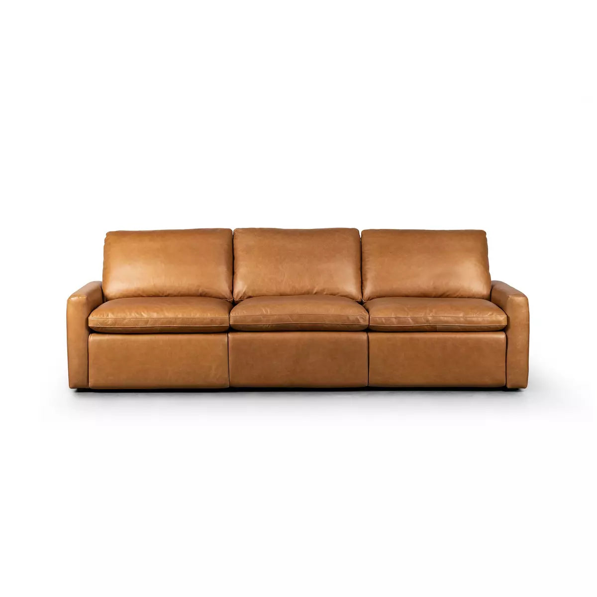 A modern take on the traditional recliner sectional Customize your comfort level with the push of hidden buttons with pieces in our Power Motion collection. Sectional features a slightly higher seat and backrest, low, sleek arms, and a motion footrest. Plush feather-blend cushions create a relaxed look and feel. Fluff cushions regularly to maintain appearance. Zero-clearance design means the chair can be placed up against a wall. Upholstered in top-grain leather exclusive to Four Hands with slightly distressed character. Includes 9'5" power cord. There is a six-motor maximum per power outlet.